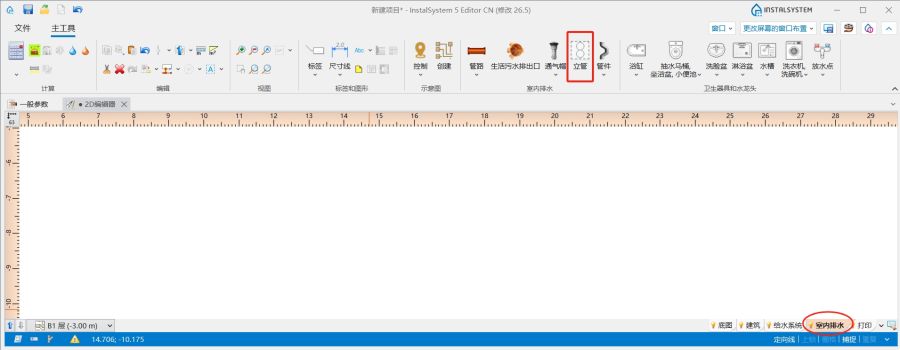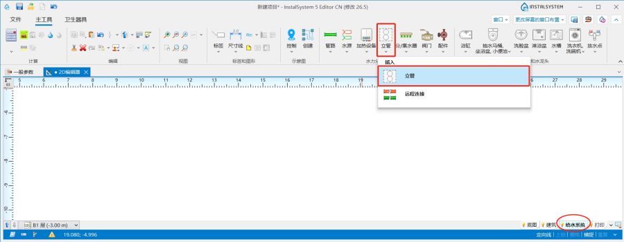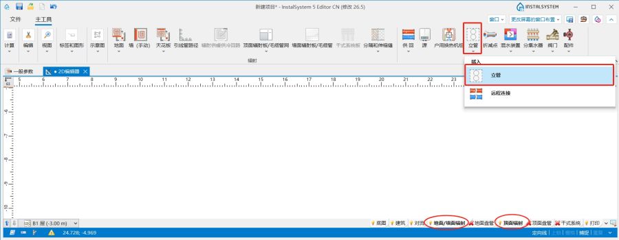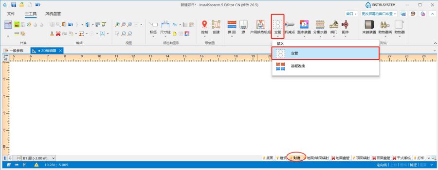 在2D编辑器 窗口,主工具 中,进入如下编辑范围,可见 立管 部件: