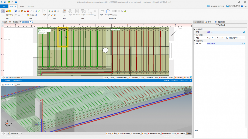 必须在这个步骤之前进行必要的设计操作。更多信息,见: 地面和墙面辐射系统的设计 以及在一般参数 窗口内的地面系统 中,从默认的系统/固定方式 选项中选择 "干式系统" - 当插入干式系统板 之前,应在参数表 窗口中选择适宜的目录。要考虑管间距和指定区域的管间距。