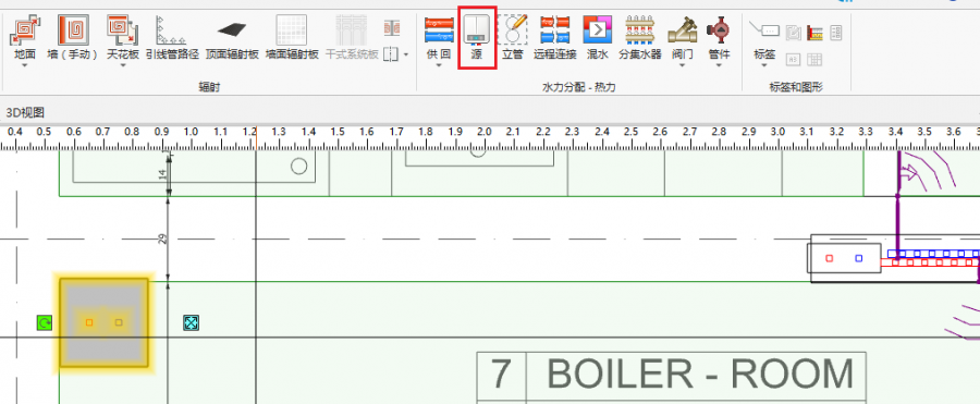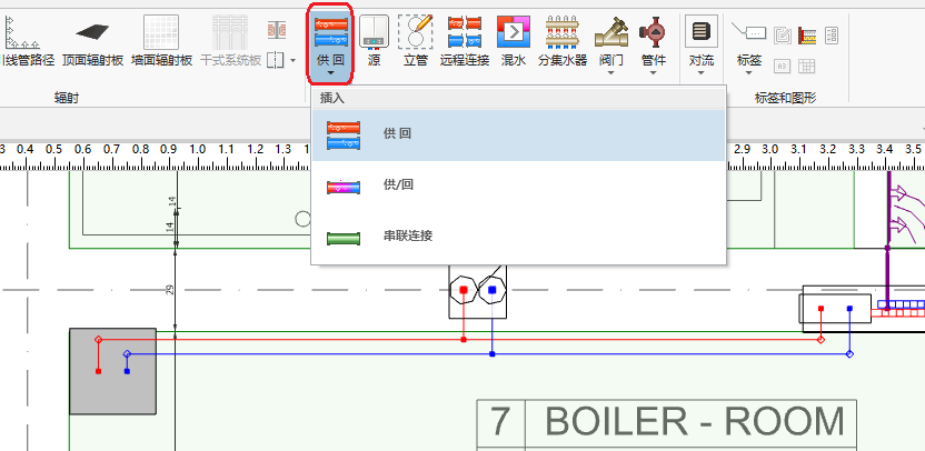 - 使用管路 部件,在捕捉 和定向线 模式下,通过绘制管网将源、分/集水器、立管 彼此连接在一起。