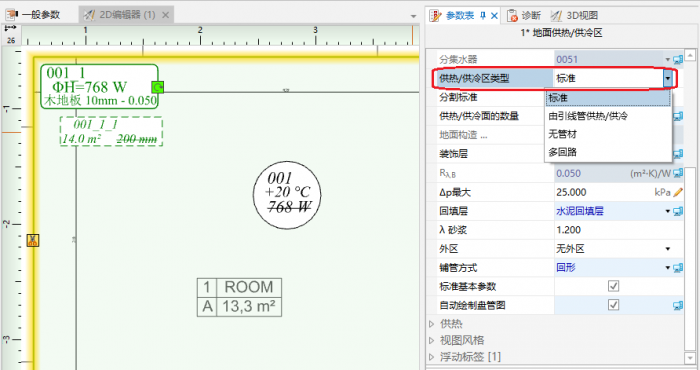- 点击被引线管覆盖较大面积的供热/供冷区 ,并在其参数表 中,将其类型更改为由引线管供热/供冷 。 注意在这种情况下,将删除与分集水器的连接。