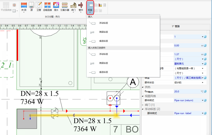 - 选中被引线管覆盖较大面积的供热/供冷区 部件的标签,并在其参数表 中,将其类型更改为由引线管供热/供冷 。 注意在这种情况下,将删除与分集水器的连接。