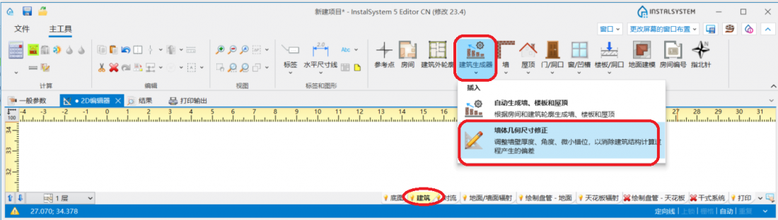 - 修改楼层间的位置 需要指定墙 类型构件相互垂直错位的公差(cm)。还必须指出要进行对齐校正的楼层。注意! 此功能仅校正墙的位置,如果需要,必须手动校正水平楼板所包围的区域。