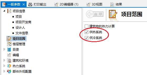 - 在一般参数 中的项目范围 标签上选择计算的范围供冷系统计算 和供热系统计算。