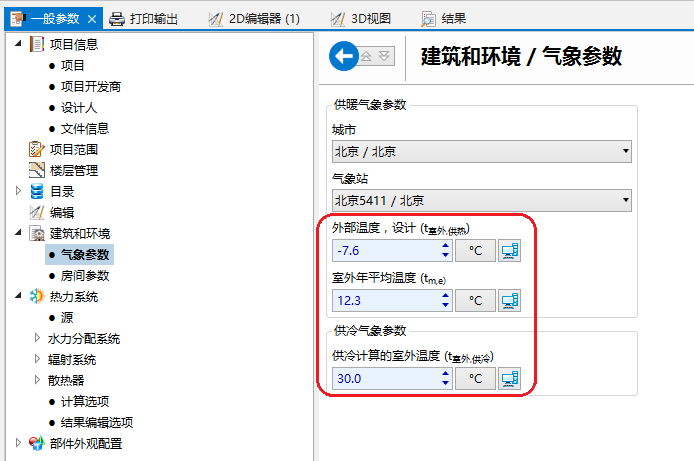 - 核实默认的参数:供热计算的室外温度 和供冷计算的室外温度。
