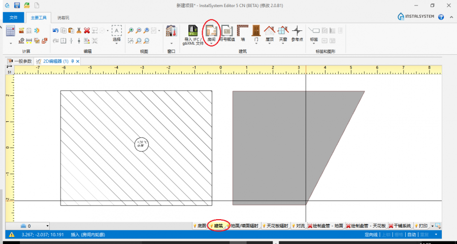 为了进行这类文件的导入,需选择窗口底部的建筑 图层标签和点击窗口上部工具条上的建筑命令图标