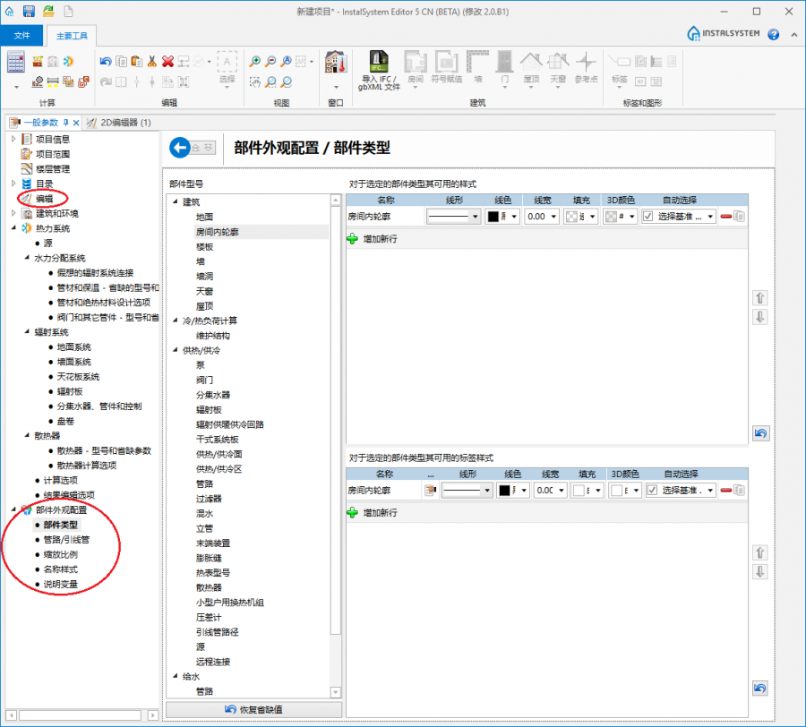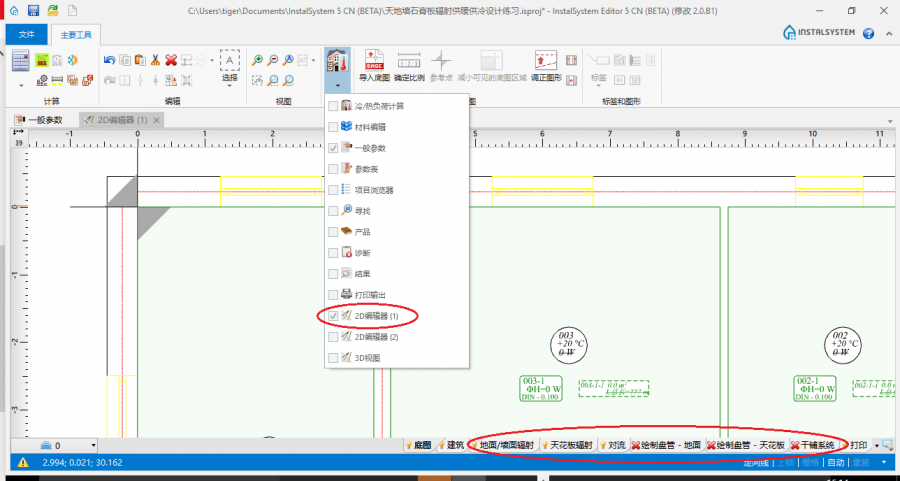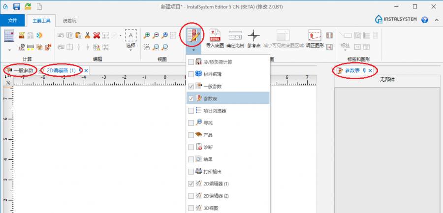 - 图形编辑 - 2D编辑器 窗口可对构成建筑结构和所设计系统的所有部件进行全部的编辑操作,并可同时打开两个2D编辑器窗口,每个窗口都可显示项目的不同部分。此窗口最重要的部件如下: