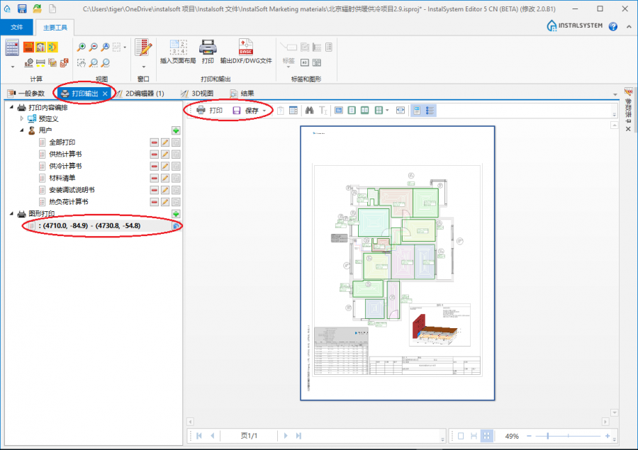 - 打印图纸 - 使用的打印输出 窗口也可打印和输出图纸。左侧在用户自定义内容编排的下方,显示了为项目定义的图形打印输出。用户可定义不同的打印输出图形布局。对于已定义的布局,在每次项目修改之后都可以用其再次打印,且页的范围、设置、样式和其它参数也会被保存。可定义多种打印输出,例如:一个导出到PDF文件、另一个发送给打印机,第三个发送到绘图仪。