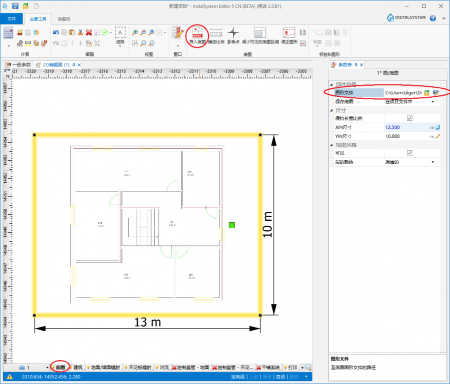 为导入底图,应选择2D编辑器 窗口中的底图 标签,然后点击工具条中的"导入底图"命令就可将图纸插入到项目中。当插入部件后,参数表 中就可看到相应的参数,在2D编辑器 窗口中就可看到导入的文件。