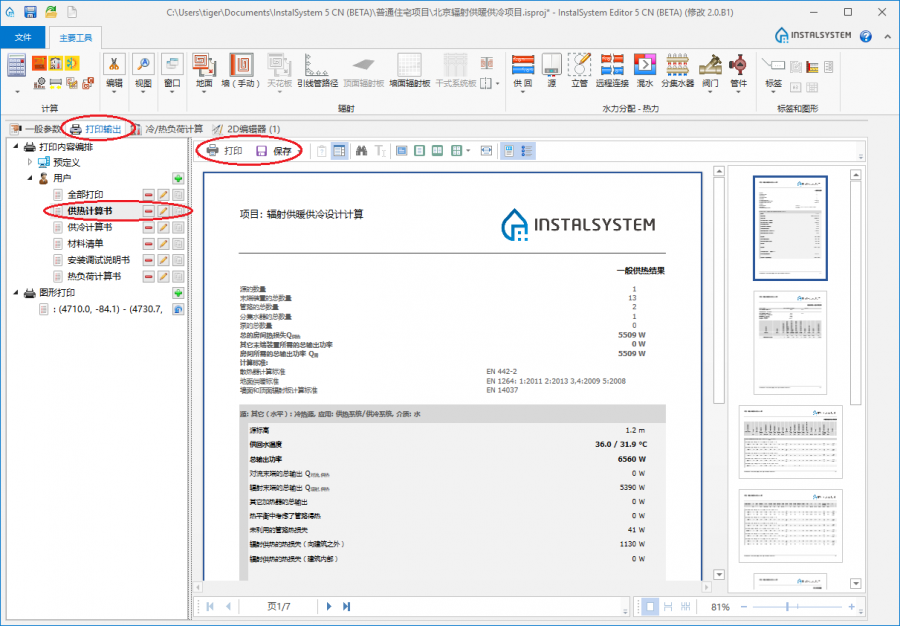 - 打印表格和清单 - 为了打印和输出,需打开打印输出 窗口。 左侧所显示的内容显示了可用的预定义打印输出的编排。预定义推荐的数量和类型取决于所使用的软件版本。可以选择某种编排并查看其内容。然后,只需选择打印 就可打印输出或选择保存、然后再选择目标文件的保存格式,就会以这种格式输出结果。也可创建并保存自定义的打印编排。这些自定义的以及预定义的编排,日后在其它项目中也可选用。