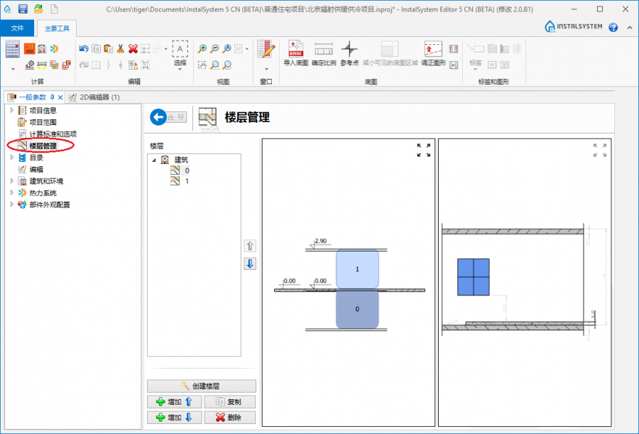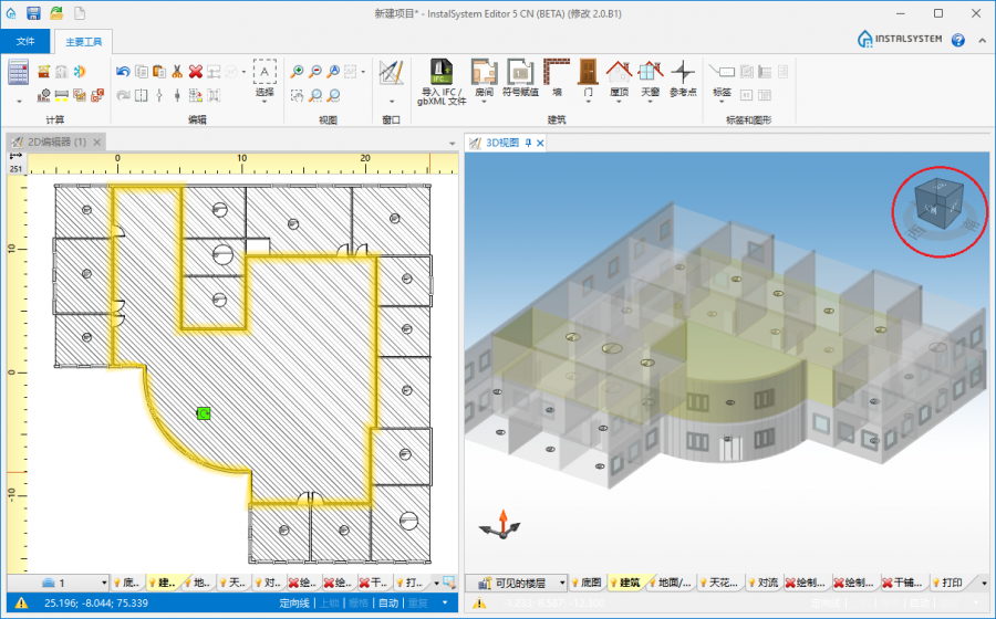 建筑结构是开展系统设计的基础。建筑物可以由几层组成。软件为每一楼层自动创建一个单独的平面图设计工作表。在那个工作表里,可对某一楼层内所设计的建筑结构和系统的部件进行编辑。项目的不同内容需在不同标签的图层上进行编辑,而整个建筑和所设计的所有系统就构成了一个完整的项目。