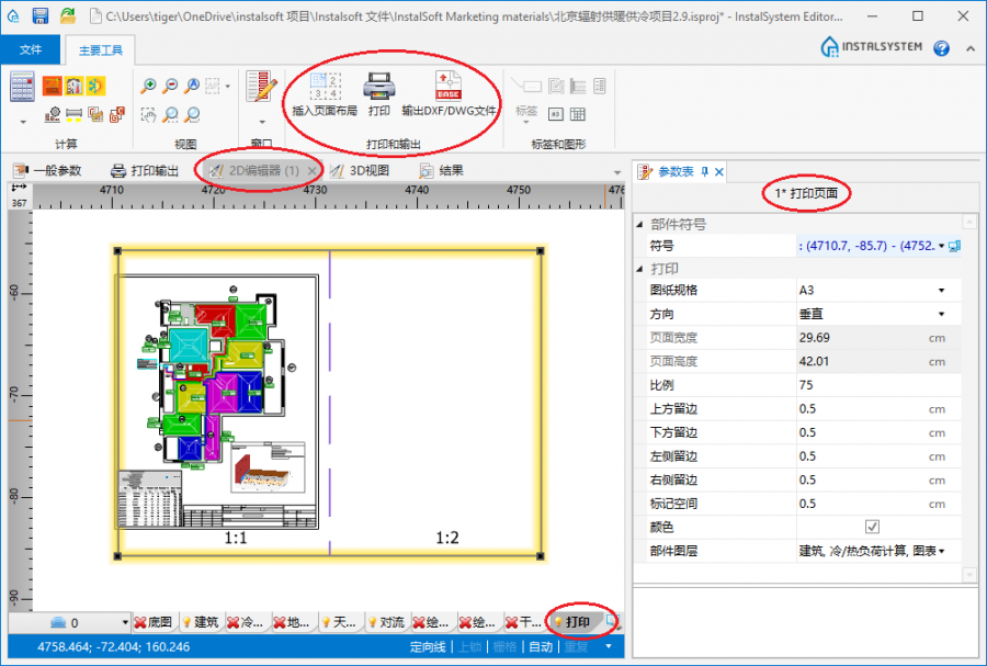 为了建立一个图形打印布局,有必要:- 在2D编辑器 窗口选择打印和输出 工具栏