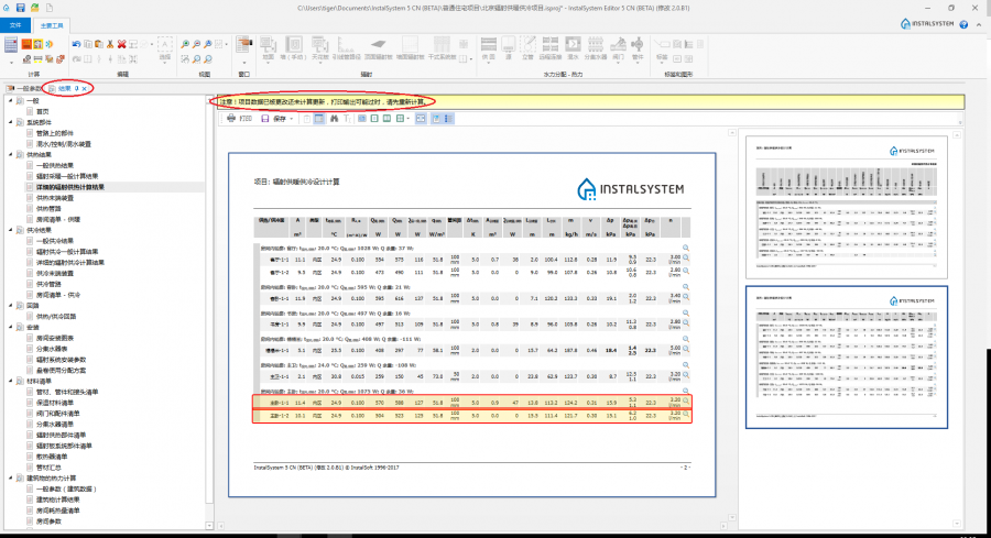 - 计算结果 - 在InstalSystem程序中,整个项目也许有"已计算"状态或"尚未计算"状态。第一次计算运行将项目状态更改为"已计算"。计算对应用程序多个窗口中显示的信息都有影响。更重要的是,第一次计算后对数据所做的更改不会导致上一次计算结果的删除,上一次的计算结果仍然存在可用。会有提示以及明显的标志警告项目的这种状态,如果项目发生了修改,标签内的结果还将画上删除线,以示提醒。最重要的结果部件是: