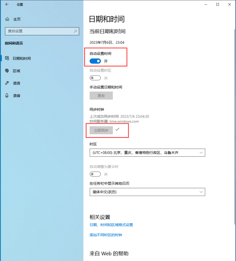必须更改Windows中的日期和时间设置,以便自动同步日期和时间。为此,启用自动设置时间 ,并使用立即同步 按钮执行时间同步。