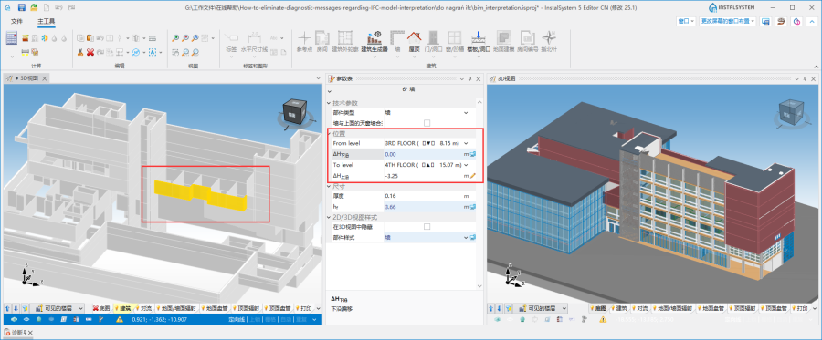 单击诊断 窗口中的错误或警告消息后,解析过程中有问题的IFC模型中的对象将在2D编辑器 ,3D视图 和项目浏览器 中高亮显示。如果此信息涉及多个部件,则这些部件将在部件 字段列表中分别列出。 消除每个错误需要分析IFC模型中对象定义的正确性。如果无法解决已识别的问题,并且设计过程中也需要它,则可以以混合方式对部件进行解析,即通过逐层、逐部件,使用自动功能来解析所选对象,然后对所需的部件手动补充所创建的建筑结构。更多信息,见: 建筑结构的准备