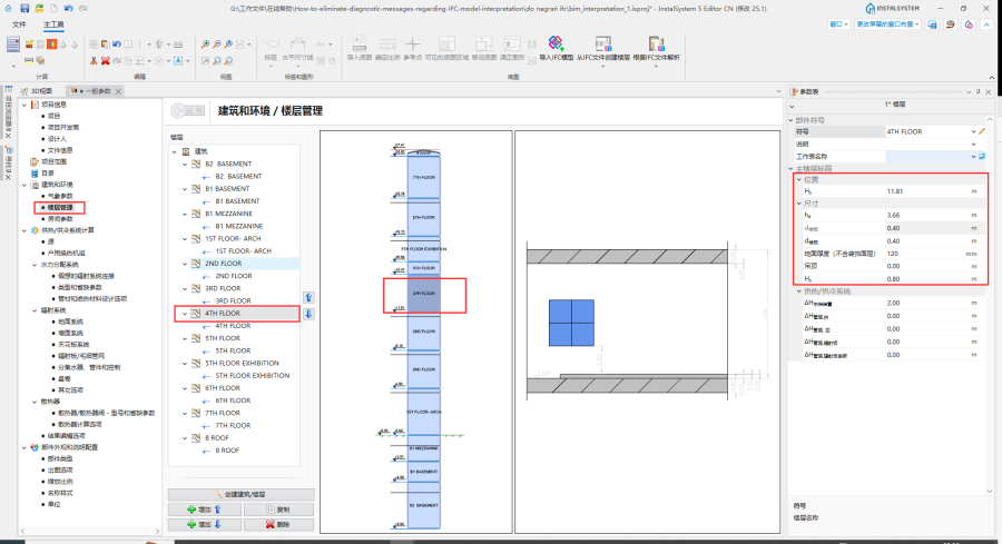 - 在一般参数 窗口,楼层管理 选项中, 检查基于IFC模型所创建的楼层的正确性。首先,应分析楼层 部件的参数,如有必要,应根据位置 和尺寸 对其进行更正。更多信息,见: BIM - 基于导入的IFC模型参数创建楼层。
