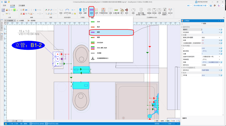 - 如果使用户用换热机组 ,需在其在参数表 的可选设置中选择生活热水循环 ,并在住宅侧绘制循环装置