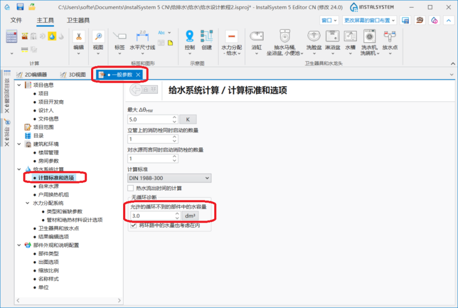 - 当在计算标准 中选择了环路(活水)连接时,该诊断也可包括环形管路中的水容量。注:不允许将热循环管路连接到环路内。