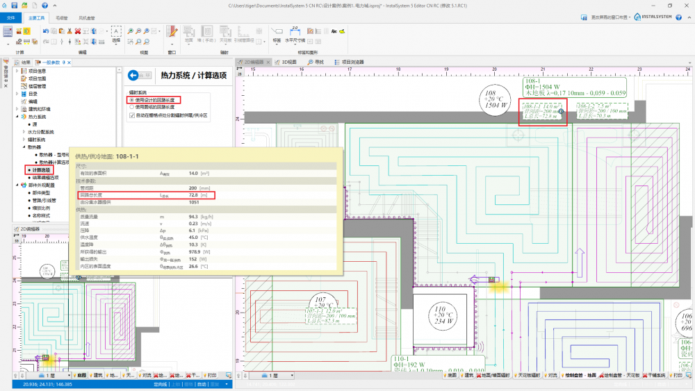 在默认设置的条件下,辐射系统回路的长度是依据回路的布置、管间距和辐射供热供冷的表面积这些基本参数确定的。