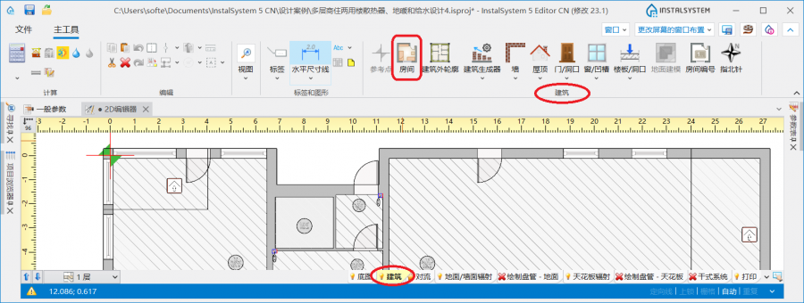 - 插入房间 所使用的命令图标位于, 进入建筑 编辑器内,在主工具 选项卡的建筑工具栏中。