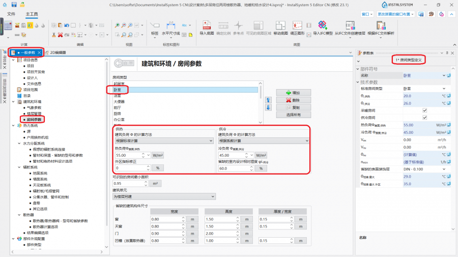 - 对于每一房间类型: 供热模式下的室内设计温度 / 供冷模式下的室内设计温度 以及用户可以修改的其它一些参数。