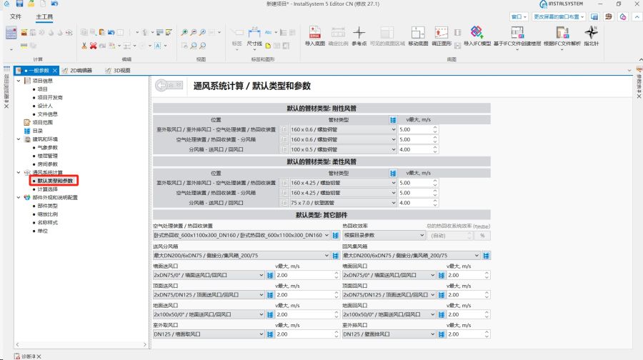 - 创建新项目时,从列表中选择包含通风系统默认参数的模板,或者,