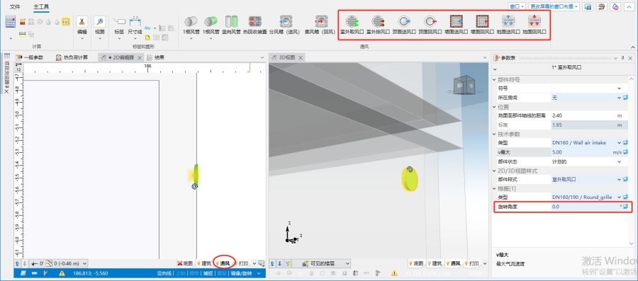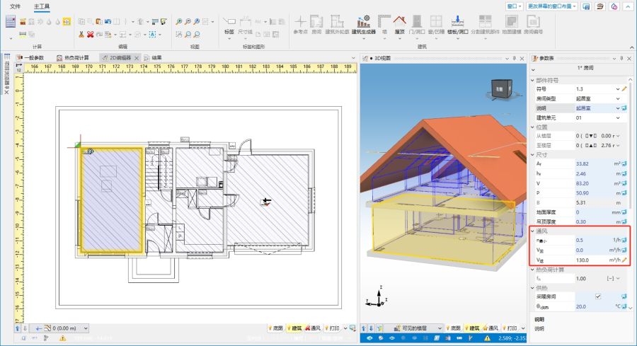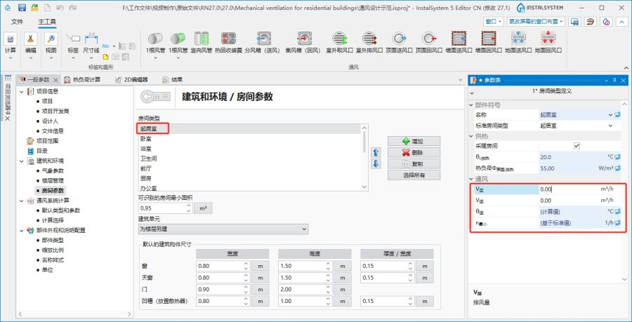 设置或修改排风量 (V回), 送风量 (V送) 或在建筑 编辑器内为每个特定房间 ,在其参数表 中设定 最小通风换气次数 (n最小) 值。
