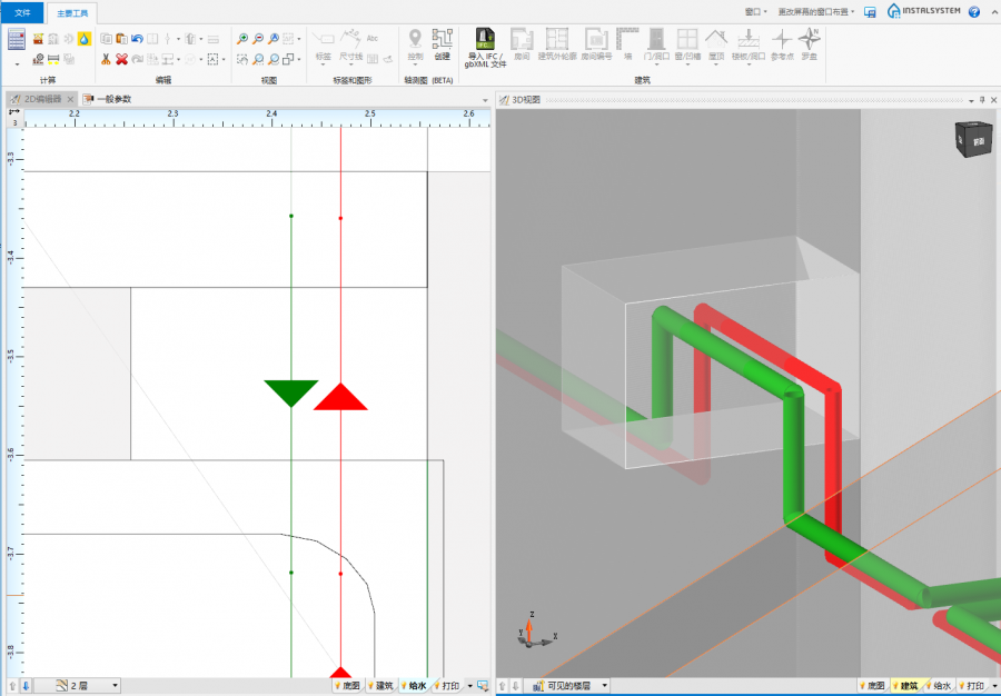 - 如果有障碍物如房梁或房门需要避开,则可修改管道的坐标。要执行此操作,可在要躲避的障碍物的两侧给管道插入分割点,然后在管道的参数表中修改管路距离地面的高度。
