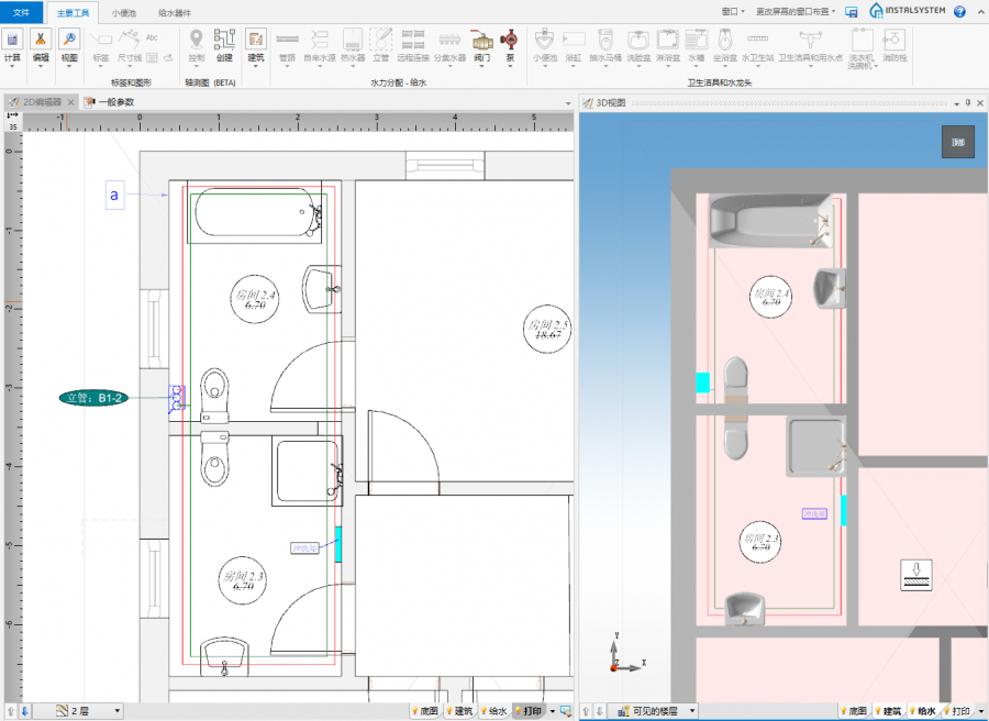 初始状态的文件位于项目表中,其中包含建筑模型和卫浴设备的布置,需要在各楼层上完成环路安装的设计。