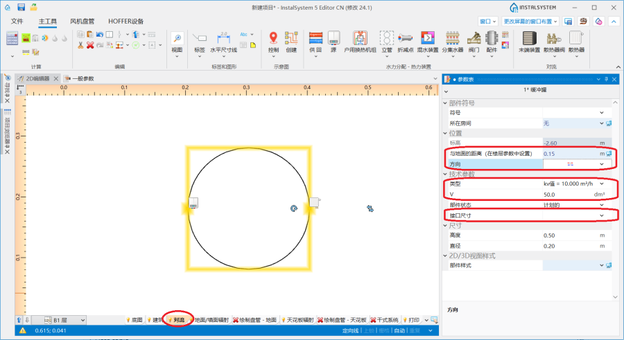 当在平面图中布置完缓冲水箱 后,可在参数表 窗口中输入或更改如下的参数: