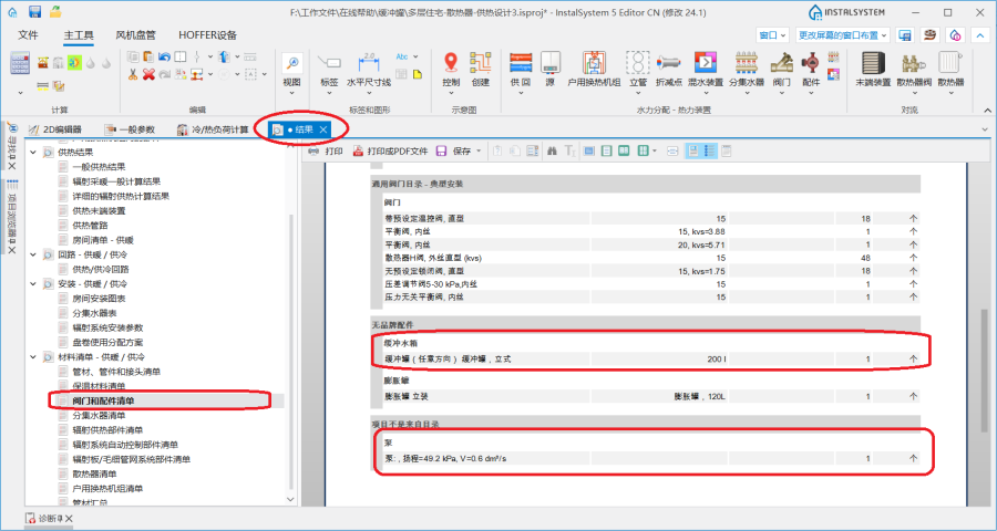 运行计算后,可以在结果 窗口中找到缓冲水箱 和泵 的类型信息。