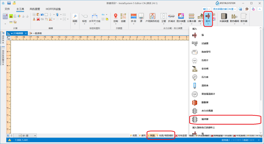 缓冲水箱 图标可在2D 编辑器 窗口,在对流 和地面/墙面辐射 编辑器中的主工具 工具栏上可见。