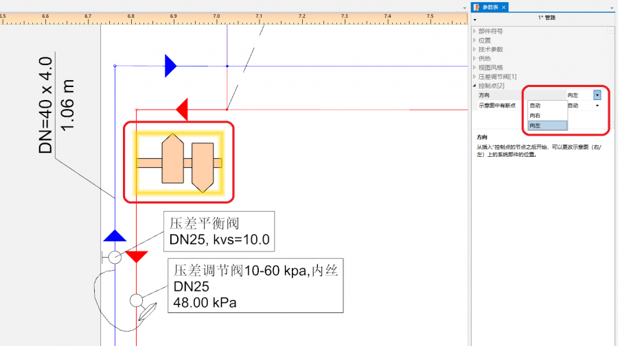 控制点 始终作用于交叉点的右侧/左侧。视频显示了通过增加控制点来修改领管路的走向,并将最不利回路/路径调整到了示意图中的第1个位置上。