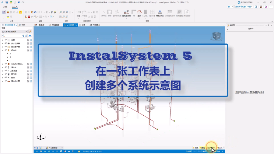 本文介绍了自动创建系统安装示意图的方法。此功能适用于以下的设计范围:供热系统计算, 供冷系统计算, 给水系统计算, 排水系统计算 和雨水排水系统计算。示意图 是一种展示基于系统模型生成的系统的形式,并可打印输出。它可手动编辑,例如添加额外的配件,并在设计过程中的任何时刻可再次生成它。 可为各个设计范围单独生成示意图 ,并且它们彼此独立。一个文件可以包括所有设计范围或仅包括选定范围的系统示意图。此外,每个设计范围还可以有多个示意图 。