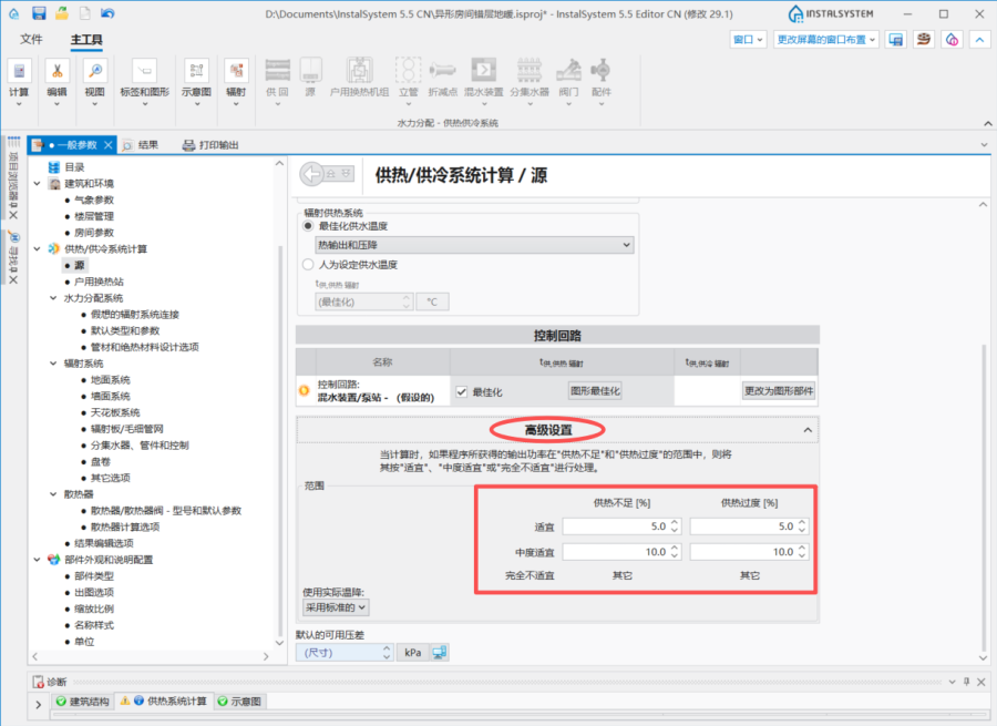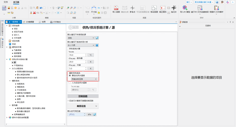 - 热输出和压降 - 程序试图选择这样一个供水温度,以确保每个供热/供冷表面的热输出尽可能接近所需的温度,同时满足过热/欠热的公差范围,并保持尽可能低的压力损失。