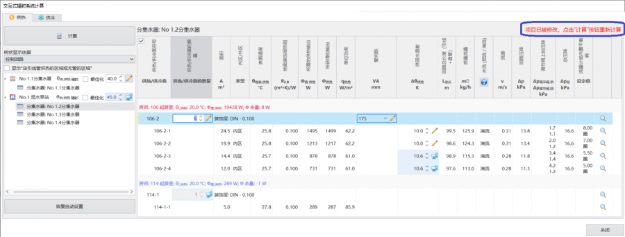 - 更改一个区域的值会使得更改的区域用另一种颜色高亮显示且显示该值。若更改供回水温差值,则结果会实时更新;若更改其他值,则需点击计算后才能更新结果。在此情况下,在窗口的右上方,会有红色项目已被修改,点击"计算"按钮重新计算 的提示。