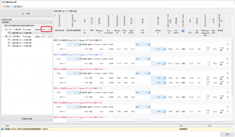 之后,需要单击计算 按钮来检查所做更改对计算结果的影响。该计算仅在辐射系统的范围内,对通过分集水器的各回路之间进行平衡的计算。在交互式计算阶段,分集水器上的控制阀/流量计或内置平衡阀的压降和设定值,是在假设分集水器入口侧供回水主管的压差等于该分集水器所需的最小资用压差值的基础上确定的。一旦关闭了交互式计算窗口,并对整个供热/供冷系统进行全面的水力计算后,分集水器控制阀/流量计或内置平衡阀的压降和设定值也会重新计算确定,计算出的分集水器入口侧供回水主管的压差值很可能会高于在交互式计算中分集水器所需的最小资用压差值。