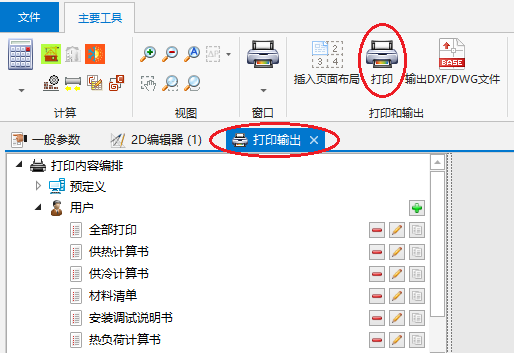该程序可将项目设计图纸和计算结果以多种文件格式(PDF、DWG、XLS等)输出和打印。输出成DWG/DXF格式的文件是由一个专门的功能完成的,而输出成其它格式的文件是通过输出到打印输出,然后选择文件格式,再进行保存来完成的。
