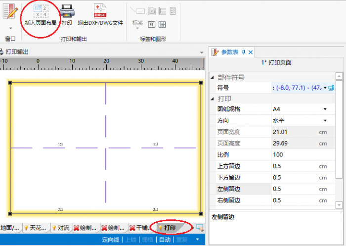 - 当打开打印 编辑范围时,在主工具 内的打印和输出 工具栏上,可见插入页面布局 图标,它允许在图中放置一个打印页面 部件。项目中每个这样的部件就是对图形的打印/输出范围的一个新的定义。