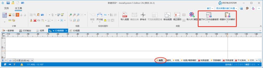 - 与基于IFC文件创建楼层 和基于IFC文件解析 相关的工具和功能,位于2D编辑器 和3D视图 窗口,并进入底图 编辑范围,在主工具 选项卡,底图 工具栏中。
