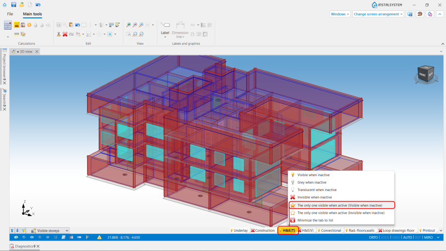 - 为了更精确地检查所创建的传热模型,可以在热负荷计算(T) 编辑器,使用主工具上的或状态栏上的 围护结构的可见性 工具。该工具在2D编辑器 和 3D视图 中可同时起作用。